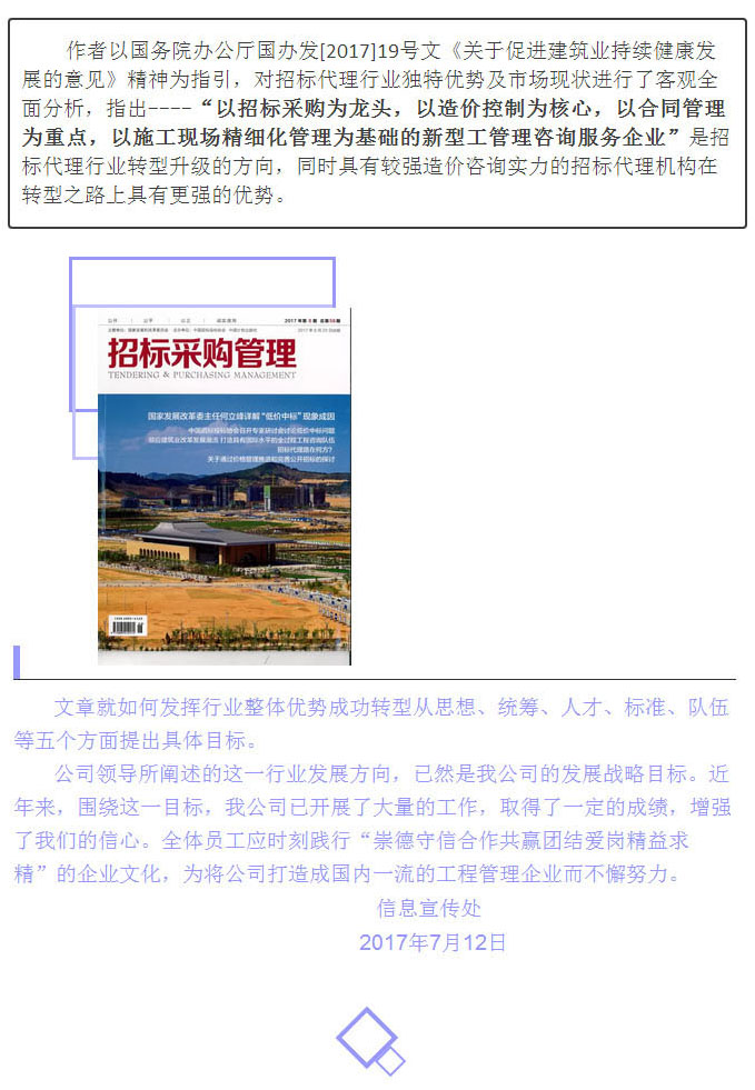 由我公司總經(jīng)理戈乃西署名的文章《順應(yīng)建筑業(yè)改革發(fā)展潮流打造具有國際水平的全過程工程咨詢隊(duì)伍》,近期在中國招標(biāo)投標(biāo)協(xié)會(huì)主辦的《招標(biāo)采購管理》2017年第6期發(fā)表。