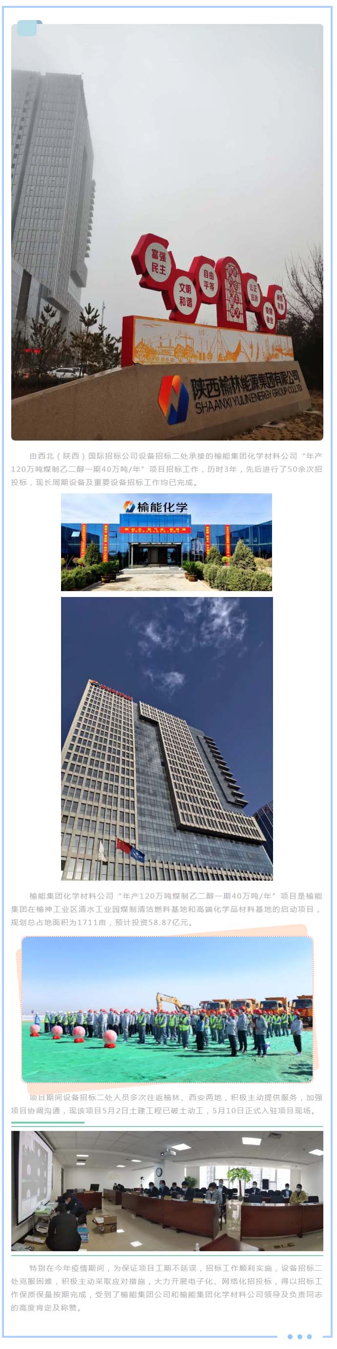 我公司承接榆能集團(tuán)化學(xué)材料公司“年產(chǎn)120萬噸煤制乙二醇一期40萬噸/年”項(xiàng)目正式入駐項(xiàng)目現(xiàn)場(chǎng)