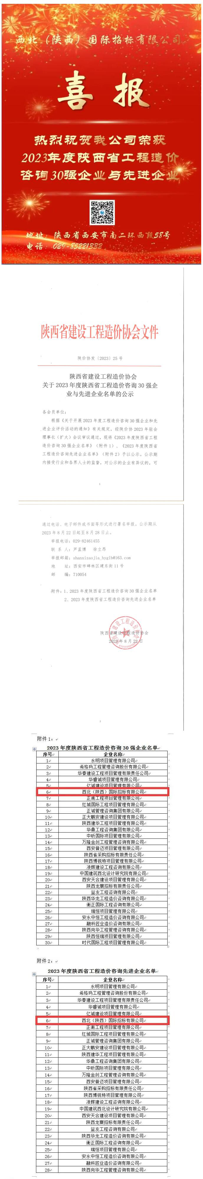 熱烈祝賀我公司榮獲2023年度陜西省工程造價咨詢30強(qiáng)企業(yè)與先進(jìn)企業(yè)