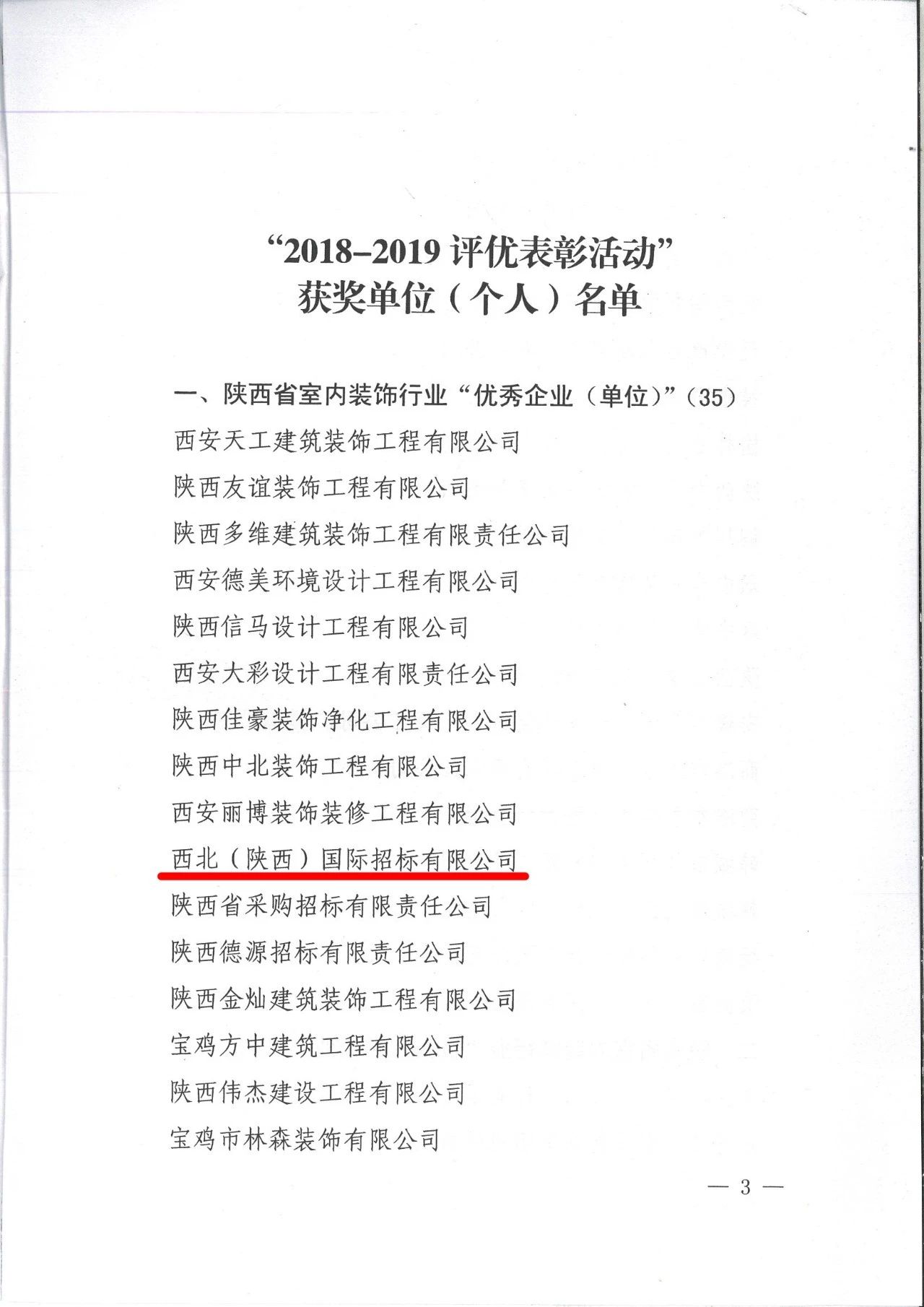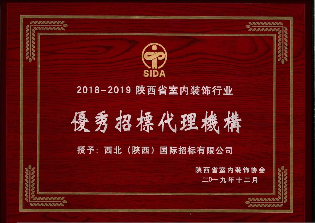 2019年12月26日,“陜西省室內(nèi)裝飾協(xié)會六屆三次理事會暨2018-2019行業(yè)表彰大會”在古都西安召開,我公司被陜西省室內(nèi)裝飾協(xié)會評為2018-2019陜西省室內(nèi)裝飾行業(yè)“優(yōu)秀招標代理機構”
